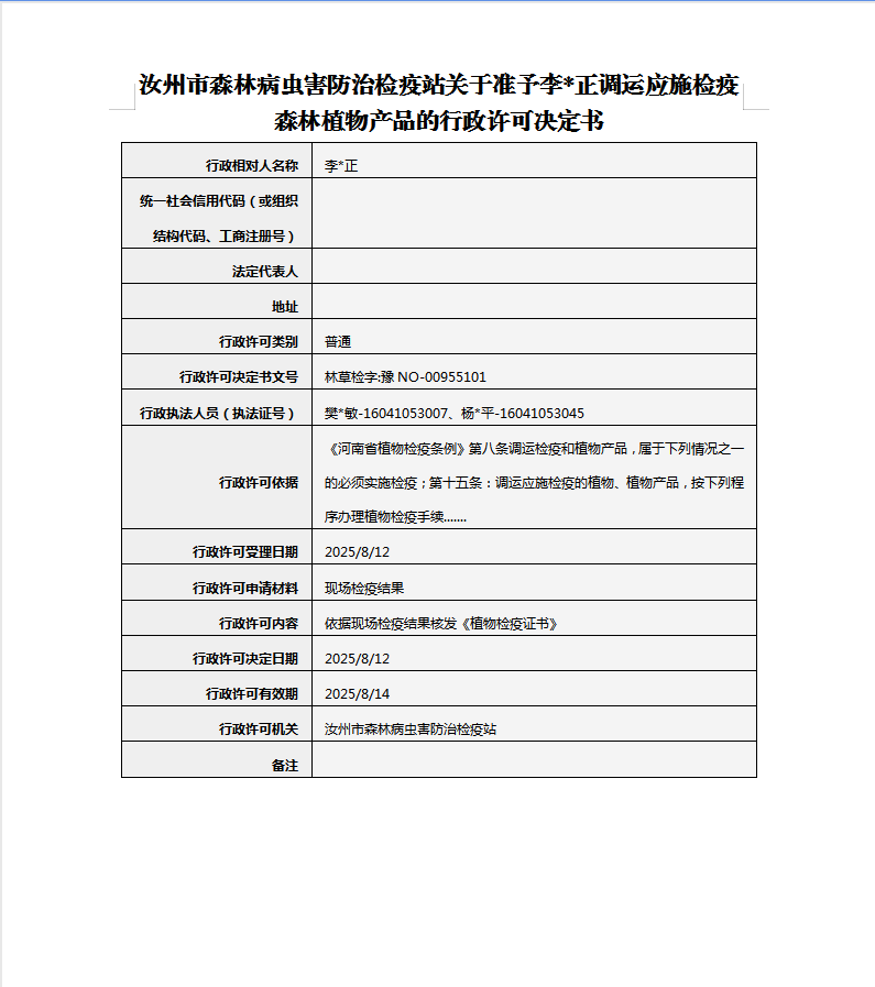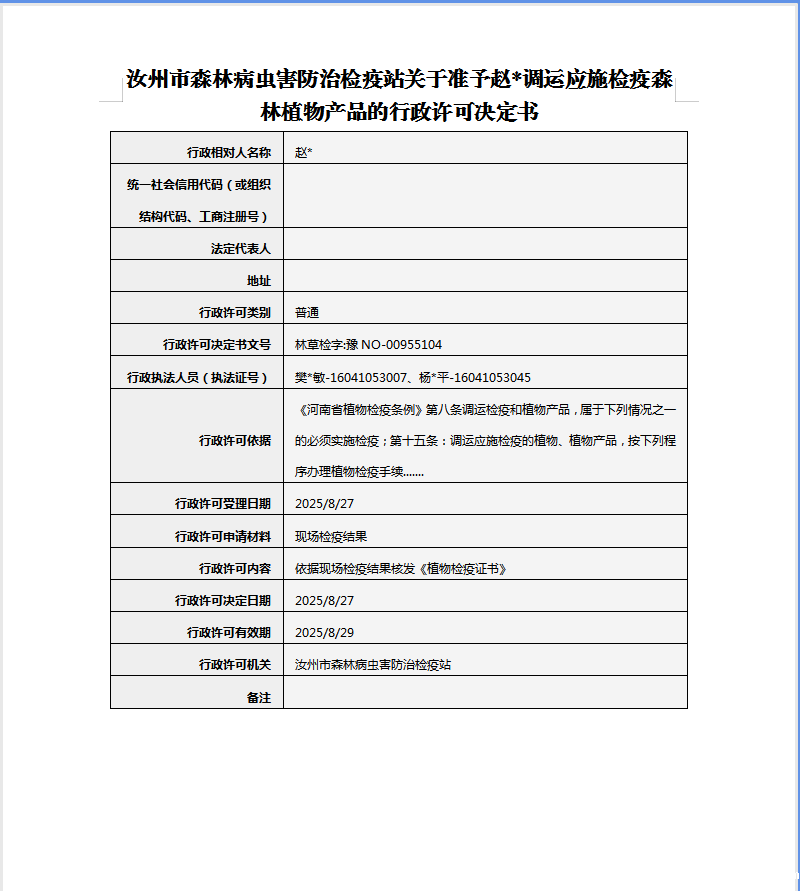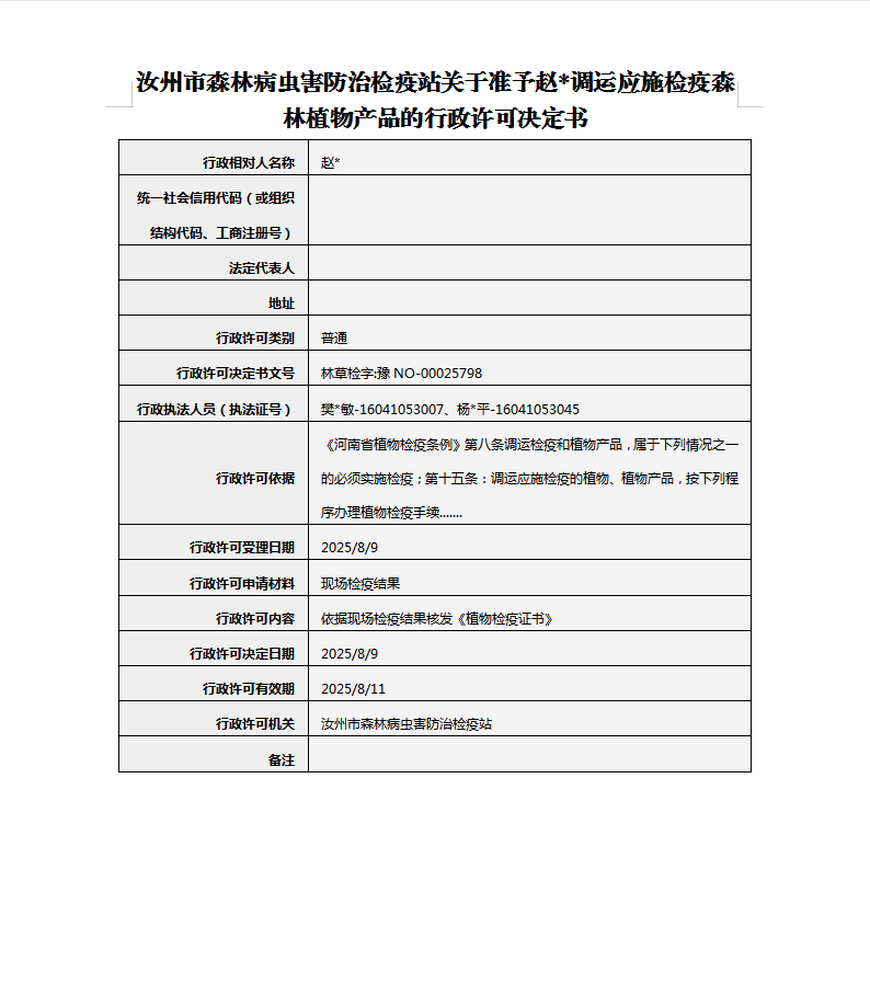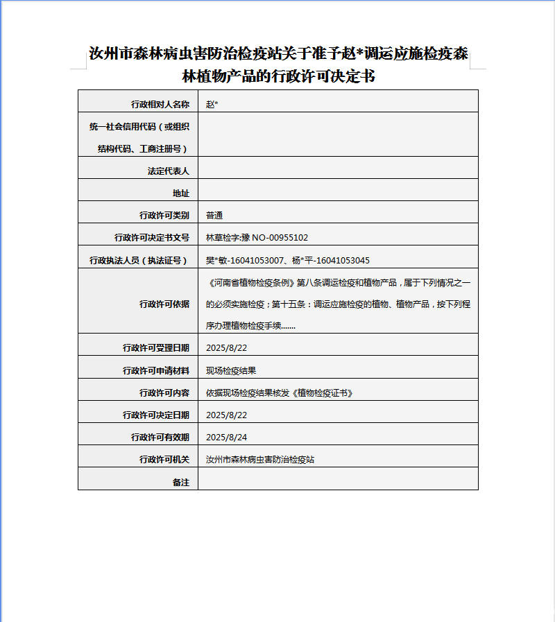 汝州市森林病虫害防治检疫站8月份调运应施检疫森林植物产品的行政许可决定书