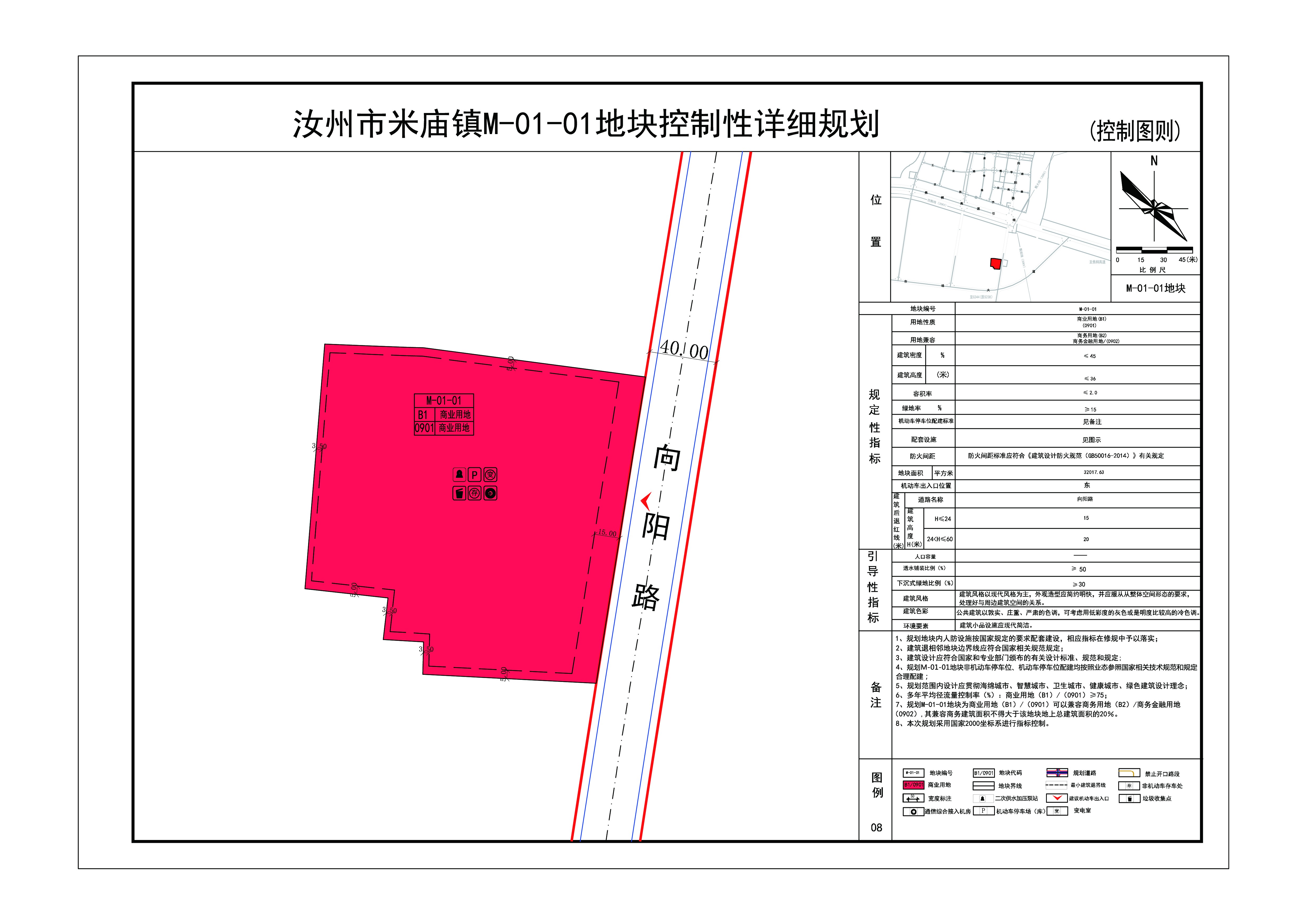 (三)用地控制性要求及指标:规划M-01-01地块用地性质为商业用地(B1/0901),兼容商务用地,其兼容商务建筑面积不得大于该地块地上总建筑面积的20%,(容积率≤2.0,建筑密度≤45%,建筑高度≤36米,绿地率≥15%);